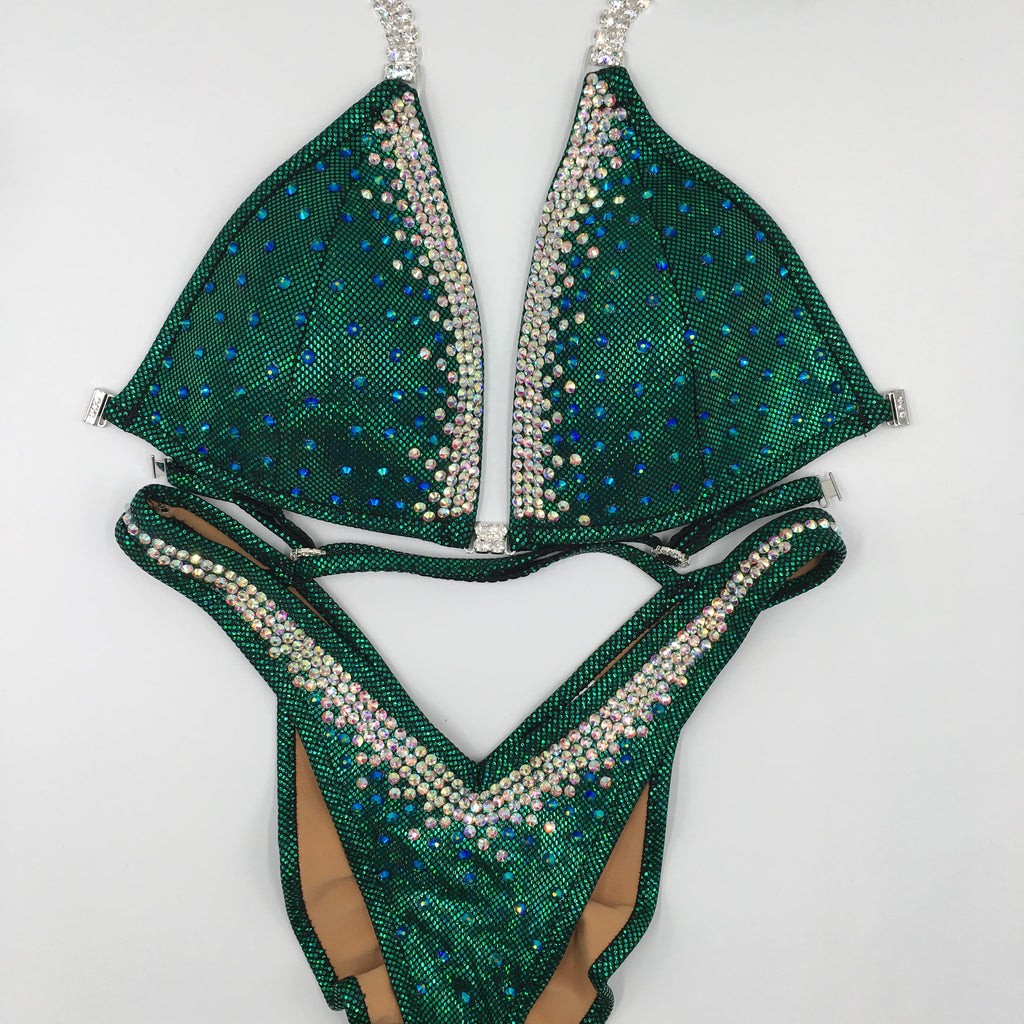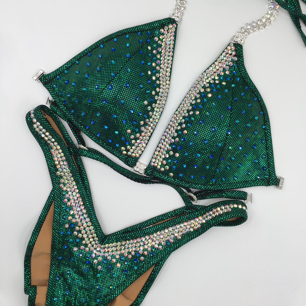 The Phoebe Multicoloured Crystal figure suit features ss20 crystals tightly packed at the neckline bursting out to a scatter of crystals spaced at approximately 10mm apart. This bikini looks great with our crystal colour as the band with a colour similar to your fabric choice, or a combination of an AB coloured crystal and its matching crystal colour. We suggest selecting up to 3 crystal colours for this style. Please select the main crystal colour that you want used for the band from our options.
