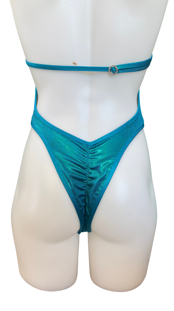 Beautiful custom, one-of-a-kind design swimsuit, royal blue with green holographic dots over the fabric for a slight green sheen.